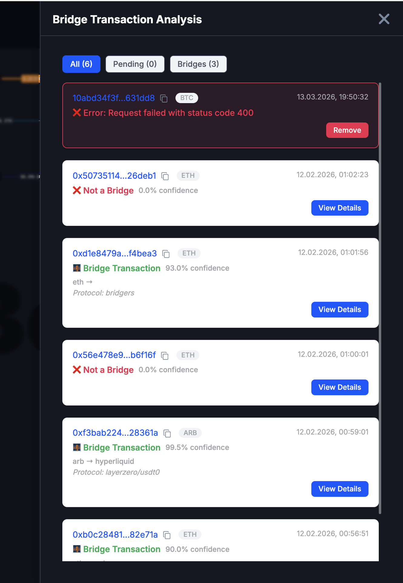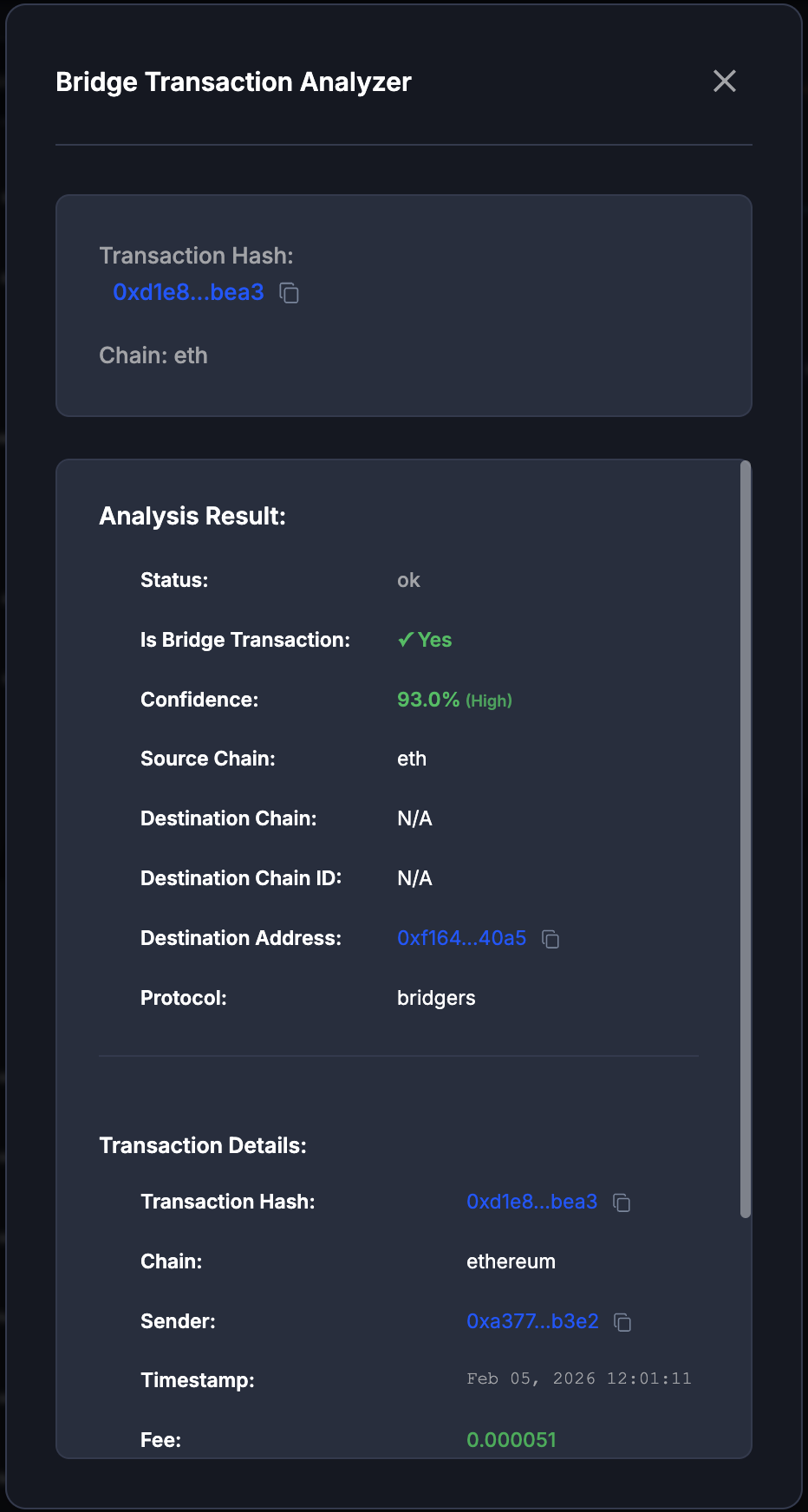 - Percentage - you can see the chance of the transaction being a bridge transfer based on detected patterns